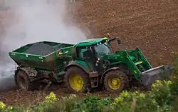 Epandeur moderne pour engrais et amendements pulvérulents. Ce type d'appareil a largement contribué au développement de l'épandage d'amendements bruts bon marché et à action lente.