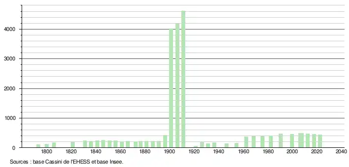 L'évolution du nombre d'habitants est connue à travers les recensements de la population effectués dans la commune depuis 1793. Pour les communes de moins de 10 000 habitants, une enquête de recensement portant sur toute la population est réalisée tous les cinq ans, les populations de référence des années intermédiaires étant quant à elles estimées par interpolation ou extrapolation[20]. Pour la commune, le premier recensement exhaustif entrant dans le cadre du nouveau dispositif a été réalisé en 2007[21].