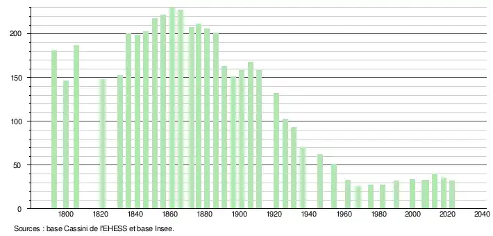L'évolution du nombre d'habitants est connue à travers les recensements de la population effectués dans la commune depuis 1793. Pour les communes de moins de 10 000 habitants, une enquête de recensement portant sur toute la population est réalisée tous les cinq ans, les populations de référence des années intermédiaires étant quant à elles estimées par interpolation ou extrapolation[19]. Pour la commune, le premier recensement exhaustif entrant dans le cadre du nouveau dispositif a été réalisé en 2007[20].