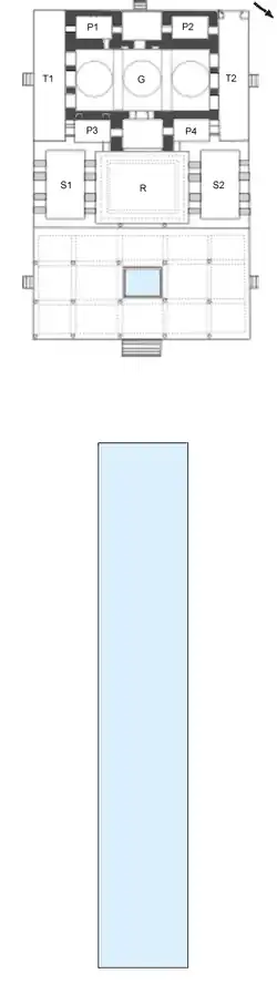Le noyau du palais est une grande salle d'audience (G), ouverte par trois petites portes, et cantonnée de quatre petites pièces aux angles (P1, P2, P3 et P4). Cette partie est couverte de trois coupoles peu profondes entre deux voûtes transversales, rappelant ainsi les structures des palais sassanides (à Firouzabad par exemple), et faisant contraste avec le talar, qui rappelle l'architecture achéménide. S'y ajoutent un grand iwan qui ouvre sur l'extérieur (entre P1 et P2) et deux portiques latéraux (T1 et T2) au nord et au sud. Un second iwan, interne (entyre P3 et P4) mène à un grand porche en trois parties, puis à un vaste talār (porche à colonnes) à l'est, avec un bassin rectangulaire au centre.