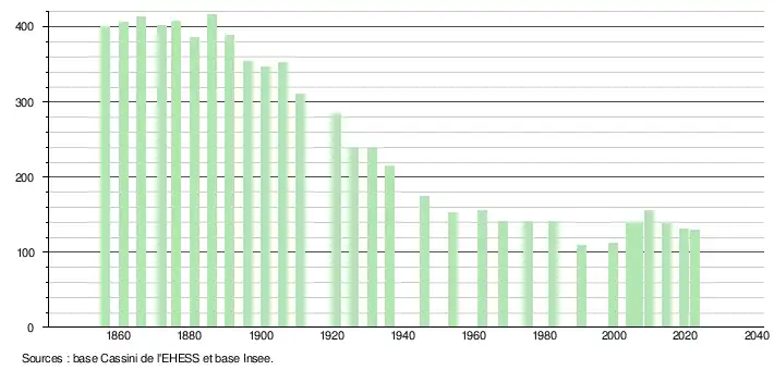 L'évolution du nombre d'habitants est connue à travers les recensements de la population effectués dans la commune depuis 1856. Pour les communes de moins de 10 000 habitants, une enquête de recensement portant sur toute la population est réalisée tous les cinq ans, les populations de référence des années intermédiaires étant quant à elles estimées par interpolation ou extrapolation[15]. Pour la commune, le premier recensement exhaustif entrant dans le cadre du nouveau dispositif a été réalisé en 2004[16].