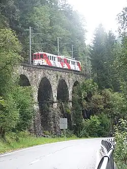 - Le viaduc des Torrents près de Finhaut, ressemble au viaduc du Triège. Il s'agit également d'une arche de 35,40 m. Il est construit au-dessus d'un couloir d'avalanche où ne coule qu'un petit ruisseau. Il est précédé et suivi de petites voûtes. Construit en béton, il est revêtu de moellons. Il se trouve en pente de 70 mm/m.