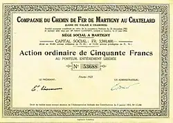 La Compagnie du Chemin de fer de Martigny au Châtelard - ligne du Valais à Chamonix (désignée par le sigle MC) est constituée par les quatre associés le 10 juin 1902[5].