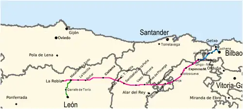 | * 1 service quotidien à Bilbao avec arrêt à San Feliz, Matallana, La Vecilla, Boñar, La Ercina, Cistierna, Sorriba, Valle de Las Casas, La Llama de la Guzpeña, Prado de La Guzpeña, Cerezal de la Guzpeña, Puente Almuhey, Valcuende, La Espina, Guardo, Guardo/Apdro., Santibáñez de la Peña, Villaverde Tarilonte, Castrejón de la Peña, Vado Cervera, Salinas de Pisuerga, Cillamayor, Mataporquera, Los Carabeos, Montes Claros, Las Rozas, Llano, Arija, Cabañas de Virtus, Soncillo, Robredo Ahedo, Dosante Cidad, Pedrosa, Sotoscueva, Redondo, Espinosa de Los Monteros, Quintana, Bercedo, Cadagua, Mercadillo, Ungo Nava, Arla-Berrón, Ballmaseda, Zalla, Aranguren/Apdro., Aranguren, Sodupe, Zaramillo, Irauregi, Zorrotza, Basurtu, Ametzola et Bilbao. | |||