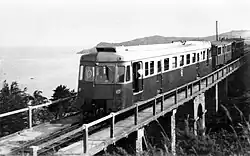 Une rame des CF-CDN sur la rampe de Rohanec'h à Saint-Brieuc. Au fond, le viaduc de Souzain