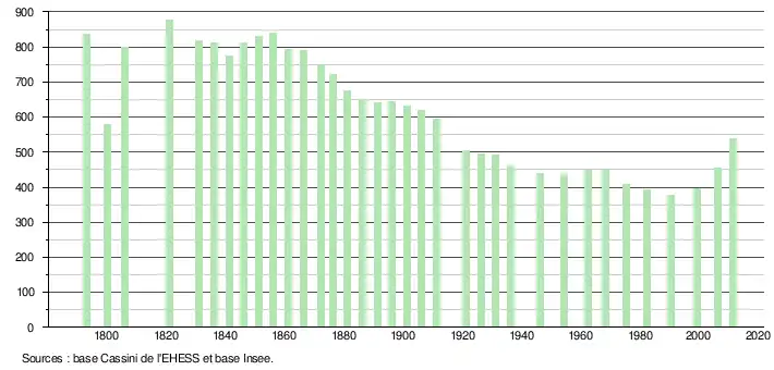 - ↑ Par convention dans Wikipédia, le principe a été retenu de n’afficher dans le tableau des recensements et le graphique, pour les populations légales postérieures à 1999, que les populations correspondant à une enquête exhaustive de recensement pour les communes de moins de 10 000 habitants, et que les populations des années 2006, 2011, 2016, etc. pour les communes de plus de 10 000 habitants, ainsi que la dernière population légale publiée par l’Insee pour l'ensemble des communes.