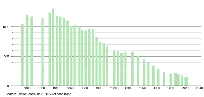 L'évolution du nombre d'habitants est connue à travers les recensements de la population effectués dans la commune depuis 1793. Pour les communes de moins de 10 000 habitants, une enquête de recensement portant sur toute la population est réalisée tous les cinq ans, les populations de référence des années intermédiaires étant quant à elles estimées par interpolation ou extrapolation[21]. Pour la commune, le premier recensement exhaustif entrant dans le cadre du nouveau dispositif a été réalisé en 2005[22].