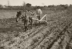 Inversement, les européens importent des machines américaines pour travailler les terres avec leurs chevaux de trait[44]. Contrairement à une erreur répandue, la mécanisation ne fait pas disparaître le cheval de trait du monde paysan, au contraire, elle l'accompagne. L'entreprise picarde Bajac commercialise une charrue brabant double réversible très réputée qui, entre 1920 et 1935, fait sa fortune. Cette époque coïncide avec l'apogée du cheval de trait agricole en France[47] et en 1938, la majorité des agriculteurs français et belges sur les moyennes et grandes exploitations l'utilise[48]. La fabrication des véhicules agricoles hippomobiles en bois aux roues cerclées de fer bat son plein dans les années 1920 en France, puis l'arrivée des premiers pneumatiques agricoles de Poclain en 1932 permet d'exploiter au maximum la puissance des chevaux[49]. Les constructeurs ne négligent pas pour autant l'arrivée du tracteur, et dès 1928, le fabricant français Huard élabore ses premiers modèles pour véhicules motorisés[50]. Vers 1930, le tracteur agricole fait encore l'objet d'une méfiance générale, et les exportations de chevaux vers les États-Unis connaissent des pics jusqu'en 1937. Vers 1940, la fiabilité du tracteur cesse d'être mis en cause[2]. Le cheval de traction agricole reste très présent jusque dans les années 1950, en raison d'une pénurie de carburant généralisée consécutive à la Seconde Guerre mondiale[51].