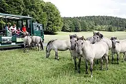 Les visiteurs du domaine des grottes de Han peuvent approcher les chevaux de Heck depuis le safari-car.