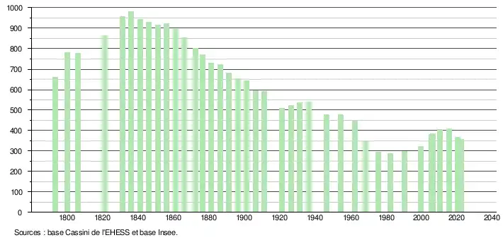 L'évolution du nombre d'habitants est connue à travers les recensements de la population effectués dans la commune depuis 1793. Pour les communes de moins de 10 000 habitants, une enquête de recensement portant sur toute la population est réalisée tous les cinq ans, les populations de référence des années intermédiaires étant quant à elles estimées par interpolation ou extrapolation[17]. Pour la commune, le premier recensement exhaustif entrant dans le cadre du nouveau dispositif a été réalisé en 2005[18].