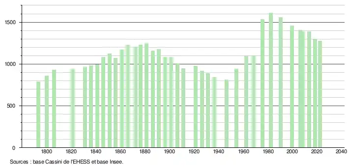 L'évolution du nombre d'habitants est connue à travers les recensements de la population effectués dans la commune depuis 1793. Pour les communes de moins de 10 000 habitants, une enquête de recensement portant sur toute la population est réalisée tous les cinq ans, les populations de référence des années intermédiaires étant quant à elles estimées par interpolation ou extrapolation[16]. Pour la commune, le premier recensement exhaustif entrant dans le cadre du nouveau dispositif a été réalisé en 2008[17].