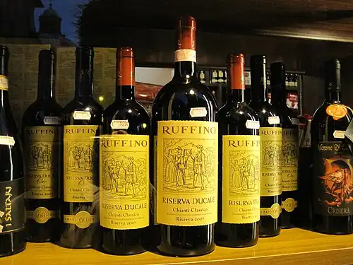 • Le Chianti Riserva doit obligatoirement vieillir douze mois en fûts de chêne et trois mois en bouteille avant d'être commercialisé. Il est normalement conditionné dans des bouteilles de forme bordelaise légèrement conique.
