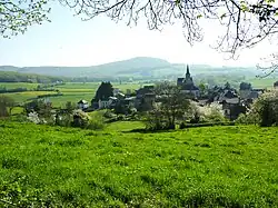 Le village et l'église de Chiddes vus de l'est, de la vallée du ruisseau du Tillot. | |