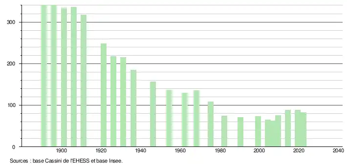 L'évolution du nombre d'habitants est connue à travers les recensements de la population effectués dans la commune depuis 1891. Pour les communes de moins de 10 000 habitants, une enquête de recensement portant sur toute la population est réalisée tous les cinq ans, les populations de référence des années intermédiaires étant quant à elles estimées par interpolation ou extrapolation[16]. Pour la commune, le premier recensement exhaustif entrant dans le cadre du nouveau dispositif a été réalisé en 2004[17].
