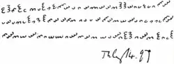 La lettre contenant le message était accompagnée d'une autre lettre datée du . Le message consiste en 87 caractères répartis sur trois lignes et choisis dans un « alphabet » de 24 caractères, dont chacun ressemble à une succession de 1, 2 ou 3 demi-cercles alignés dans une direction parmi 8 possibles. Un point, dont la signification n'est pas connue, apparaît trois caractères avant la fin de la première ligne.