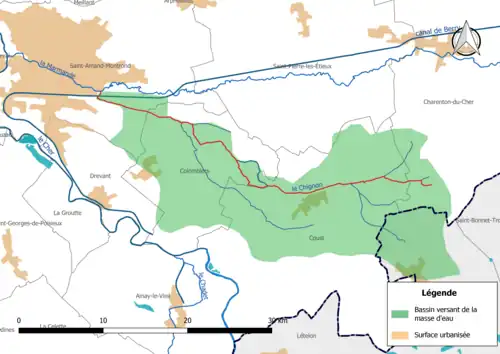 Le Chignon traverse 4 communes, soit de l'amont vers l'aval : Charenton-du-Cher, Coust, Colombiers, Saint-Amand-Montrond (Cher).