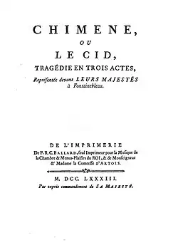 - Livret original: Chimène, ou Le Cid, tragédie en trois actes, Représentée devant Leurs Majestés à Fontainebleau , Paris, Ballard, 1783 (accessible en ligne sur Google Books)