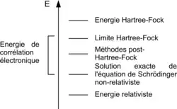 La méthode ab initio la plus simple de calcul de structure électronique est le schéma Hartree-Fock (HF), dans laquelle la répulsion coulombienne électron-électron n'est pas spécifiquement prise en compte. Seul son effet moyen est inclus dans le calcul. Lorsque la taille de la base est augmentée, l'énergie et la fonction d'onde tendent vers une limite appelée limite Hartree-Fock. De nombreux types de calculs, connus sous le nom de méthodes post-Hartree-Fock, commencent par un calcul Hartree-Fock et sont ensuite corrigés pour la répulsion électron-électron, aussi connue comme corrélation électronique. Lorsque ces méthodes sont poussées vers leurs limites, elles approchent[19] de la solution exacte de l'équation de Schrödinger non-relativiste. Si l'on veut obtenir un accord exact avec l'expérience, il est nécessaire d'inclure les termes relativiste et de spin-orbite, les deux n'étant importants uniquement pour les atomes lourds. Dans toutes ces approches, en plus du choix de la méthode, il est nécessaire de choisir une base adéquate. Cette base (au sens mathématique du terme) est un ensemble de fonctions, habituellement centrées sur les différents atomes de la molécule[20], qui sont utilisées pour étendre les orbitales moléculaires par le postulat[21] de combinaison linéaire d'orbitales atomiques (LCAO). Les méthodes ab initio nécessitent donc d'établir un niveau d'application de la théorie (méthode) et une base.