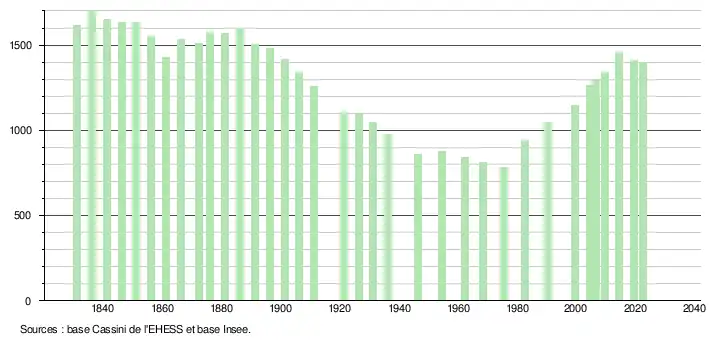 L'évolution du nombre d'habitants est connue à travers les recensements de la population effectués dans la commune depuis 1831. Pour les communes de moins de 10 000 habitants, une enquête de recensement portant sur toute la population est réalisée tous les cinq ans, les populations de référence des années intermédiaires étant quant à elles estimées par interpolation ou extrapolation[16]. Pour la commune, le premier recensement exhaustif entrant dans le cadre du nouveau dispositif a été réalisé en 2004[17].