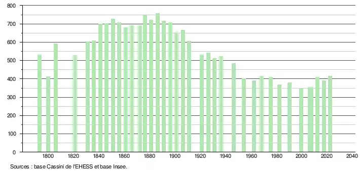 L'évolution du nombre d'habitants est connue à travers les recensements de la population effectués dans la commune depuis 1793. Pour les communes de moins de 10000habitants, une enquête de recensement portant sur toute la population est réalisée tous les cinqans, les populations de référence des années intermédiaires étant quant à elles estimées par interpolation ou extrapolation[14]. Pour la commune, le premier recensement exhaustif entrant dans le cadre du nouveau dispositif a été réalisé en 2007[15].