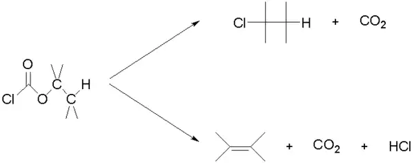 Ils sont d’une stabilité thermique variable et leur utilisation a donné lieu à de nombreux incidents[5] : les chloroformiates d’aryles sont très stables à température ambiante, les chloroformiates de méthyle et d’alkyles primaires sont assez stables, les chloroformiates de benzyle et d’alkyles secondaires sont moins stables mais quelques-uns sont tout de même commerciaux[6],[7],[8]. Les chloroformiates d’alkyles tertiaires quant à eux sont instables à température ambiante. La décomposition se fait suivant les deux voies indiquées sur le schéma ci-dessous, avec une forte préférence pour l’obtention du chlorure d'alkyle. En outre, les produits obtenus sont souvent issus de réarrangements du squelette carboné.