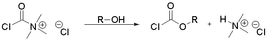 La réaction se fait par ajout de l’alcool à une solution contenant un excès de phosgène ; elle peut se dérouler à température ambiante ou en dessous pour réduire la formation de carbonate de dialkyle. Il peut être utile de mener cette synthèse en présence d’une amine tertiaire ; la suppression de l’acide chlorhydrique permet d’une part de minimiser les réactions secondaires au cas où le groupe R est sensible aux acides, d’autre part d’augmenter la cinétique de la réaction (la réaction passe alors probablement par un intermédiaire ammonium qui est un excellent agent acylant, voir le schéma suivant). Le complexe formé par deux moles de pyridine et une mole de phosgène est connu pour être un agent acylant très actif.