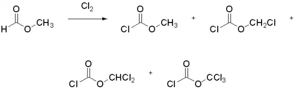Des formiates d’alkyles ont été chlorés par voie radicalaire pour donner des chloroformiates, mais cette voie aboutit à un mélange de différents produits chlorés.
