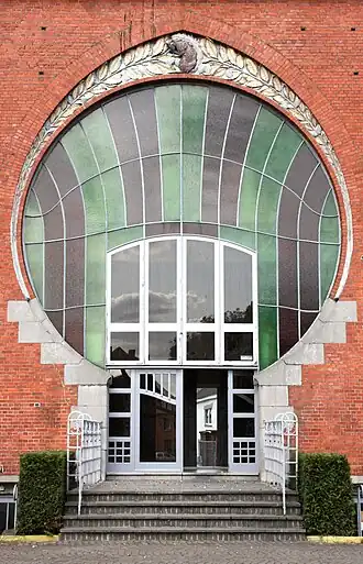 Ce bâtiment industriel en brique rouge d'une longueur d'environ 170 m vaut surtout par son entrée monumentale représentée par une immense rosace en arc outrepassé ornée de vitraux bicolores. Cet arc outrepassé est entouré par une frise représentant un rameau végétal parsemé de fèves de cacao et menant à un écureuil, emblème de la marque Rosmeulen. Cette frise forme un arc brisé.