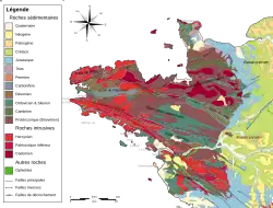 Au niveau régional, le territoire de Cholet est situé dans le domaine sud armoricain (plus précisément le domaine choletais[8]) marqué par la phase orogénique bretonne de l'orogenèse varisque, au début du Carbonifère inférieur, ou Tournaisien, il y a environ 360 Ma[9]. La collision continentale au cours de l'orogenèse varisque proprement dite se traduit dans le Massif armoricain par un métamorphisme général de basse-moyenne pression, formant les gneiss et micaschistes, par des phases de cisaillement et par une anatexie générant migmatites et granites. Elle se traduit enfin, par la mise en place de nombreux leucogranites (à deux micas muscovite et biotite) intrusifs à travers les schistes cristallins, concomitamment aux cisaillements et à ce métamorphisme. Cholet fait ainsi partie d'une grande ceinture de leucogranites au sud du Massif armoricain. Cette ceinture correspond à un immense batholite mis en place dans des roches métamorphiques, seuls quelques plutons atteignant le Paléozoïque épimétamorphique. Ce batholite est subdivisé en plusieurs bandes (« rubans ») qui montrent une nette divergence vers l'Est[10] : un axe majeur (Pointe du Raz - Nantes - Parthenay - Millevaches) à convexité nord-est (orienté N 110-130 °E) associé au cisaillement sud-armoricain (décrochement dextre selon une orientation cadomienne dont le rejet horizontal atteindrait 500 km[11]), duquel fait partie Cholet[12] ; au nord de cet axe, la bande Locronan-Lizio correspondant à plusieurs rubans orientés N 60 à 100°E (chapelet d'apophyses Bignan, Guéhenno, Savenay, etc.) ; au sud de cet axe, une échine discontinue de moles syntectoniques (massifs de Trégunc, Pont-l'Abbé, Port-Louis-Ploemeur, Glénan-Quiberon-Houat-Hoedic-Guérande-Le Croisic, Saint-Brévin, Noirmoutier-La Roche-sur-Yon) allongés en direction sud-armoricaine dont le parallélisme avec le cisaillement sud-armoricaine incite à penser à l'influence indirecte d'une contrainte linéamentaire[13]. Ces granites intrusifs, datés de 320 millions d'années, sont produits par fusion de métasédiments avec des taux de fusion faibles, probablement en relation avec des processus de relaxation thermique[14].
