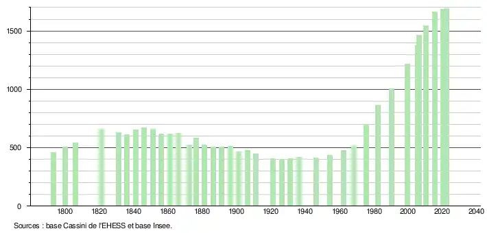 L'évolution du nombre d'habitants est connue à travers les recensements de la population effectués dans la commune depuis 1793. Pour les communes de moins de 10 000 habitants, une enquête de recensement portant sur toute la population est réalisée tous les cinq ans, les populations de référence des années intermédiaires étant quant à elles estimées par interpolation ou extrapolation[17]. Pour la commune, le premier recensement exhaustif entrant dans le cadre du nouveau dispositif a été réalisé en 2005[18].