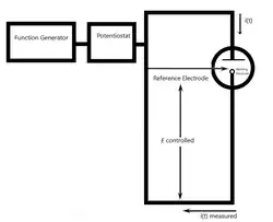La cellule d'électrolyse (en masse) à potentiel contrôlé est généralement une cellule à deux compartiments (divisée), contenant une anode auxiliaire en tige de carbone et est séparée du compartiment de la cathode par une bougie d'électrolyte à solvant de verre fritté et de méthylcellulose[7]. La raison de la cellule à deux compartiments est de séparer la réaction cathodique et anodique. L'électrode de travail pour l'électrolyse en masse pourrait être un disque RVC, qui a une plus grande surface pour augmenter la vitesse de la réaction[8].
