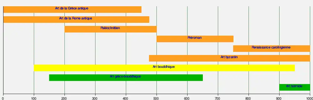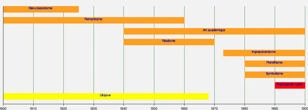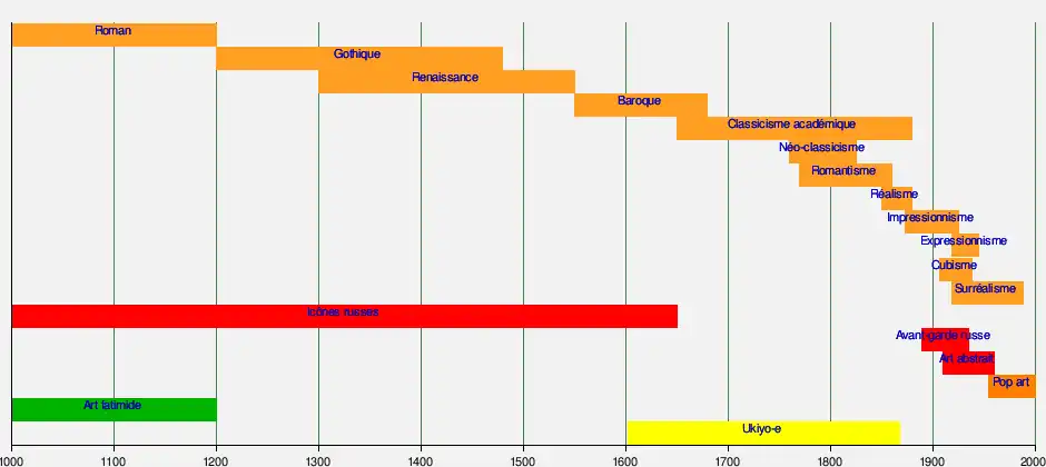 La frise suivante présente les périodes d'expression prédominante des différents mouvements artistiques apparus en Europe (orange), en Asie (jaune), au Moyen-Orient (vert), en Russie (rouge) et aux États-Unis (orange sombre) :