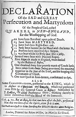 - 1660 : Début des persécutions systématiques contre les quakers, qui dureront jusqu'à la fin des années 1660. Mary Dyer (1611?-1660) est condamnée à mort la premiere et pendue.