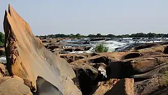Le fleuve, d'une largeur de plus de 1 000 m en amont des chutes, ne fait plus que 210 m en aval après avoir traversé un amat de roches. La dénivellation est d'environ 14 m. Le débit varie considérablement et peut passer de 3 m3/s en mai, à 5 000 m3/s en octobre (valeurs extrêmes relevées à l'embouchure).