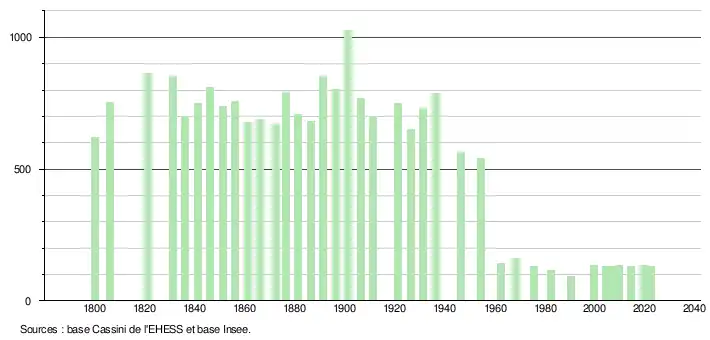 L'évolution du nombre d'habitants est connue à travers les recensements de la population effectués dans la commune depuis 1800. Pour les communes de moins de 10 000 habitants, une enquête de recensement portant sur toute la population est réalisée tous les cinq ans, les populations de référence des années intermédiaires étant quant à elles estimées par interpolation ou extrapolation[7]. Pour la commune, le premier recensement exhaustif entrant dans le cadre du nouveau dispositif a été réalisé en 2004[8].