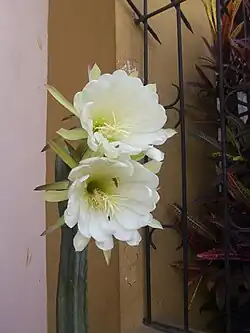 Les fleurs blanches peuvent mesurer jusqu'à 16 cm de long. La floraison apparait vers cinq à six ans et est abondante au cours des nuits d'été.