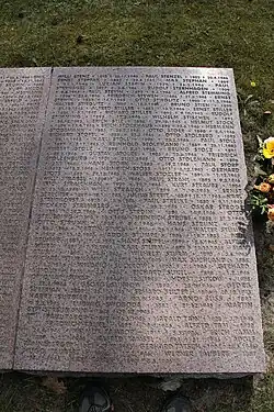 Le monument aux morts érigé en 1960[9] est banal, presque martial. Il est réalisé en grès de Saxe comme les premières dalles tombales qu'il a fallu remplacer avec le temps car les inscriptions devenaient illisibles. Avant de rappeler la présence des morts présents dans le cimetière, le monument reflète objectivement presque plus la mentalité et la conception punitive des choses qu’avait l’administration communale de l’époque pour tout ce qui concerne le souvenir de soldats et de prisonniers considérés comme fascistes d’un temps révolu que le régime de la RDA entendait enterrer à jamais pour construire une nouvelle Allemagne. Il a fallu de longs pourparlers entre l’administration locale et le pasteur Teichmann pour se mettre d’accord sur la devise gravée sur le monument : « Les morts nous exhortent à vivre pour la paix »[N 2]. On devine que la devise devait être exempte de toute connotation religieuse et en même temps ne pas être trop laudative et affective. Le texte nous dit indirectement de manière froide et injonctive que les morts inhumés dans le cimetière n’ont pas forcément lutté pour la paix, mais que leur mort montre bien en revanche que seule une attitude de paix empêche ce qui s’est passé pendant le dernier conflit mondial.