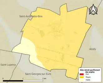 Le retrait-gonflement des sols argileux est susceptible d'engendrer des dommages importants aux bâtiments en cas d’alternance de périodes de sécheresse et de pluie. 89,4 % de la superficie communale est en aléa moyen ou fort (52,8 % au niveau départemental et 48,5 % au niveau national). Sur les 168 bâtiments dénombrés sur la commune en 2019, 168 sont en aléa moyen ou fort, soit 100 %, à comparer aux 70 % au niveau départemental et 54 % au niveau national. Une cartographie de l'exposition du territoire national au retrait gonflement des sols argileux est disponible sur le site du BRGM[17],[Carte 2].