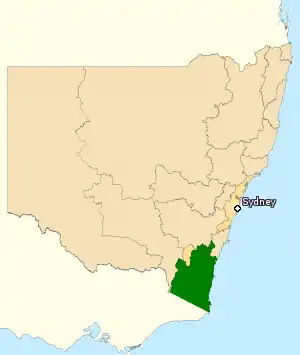 La circonscription d'Eden-Monaro(en vert) au sud de la Nouvelle-Galles du Sud.