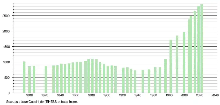 L'évolution du nombre d'habitants est connue à travers les recensements de la population effectués dans la commune depuis 1793. Pour les communes de moins de 10 000 habitants, une enquête de recensement portant sur toute la population est réalisée tous les cinq ans, les populations de référence des années intermédiaires étant quant à elles estimées par interpolation ou extrapolation[31]. Pour la commune, le premier recensement exhaustif entrant dans le cadre du nouveau dispositif a été réalisé en 2008[32].
