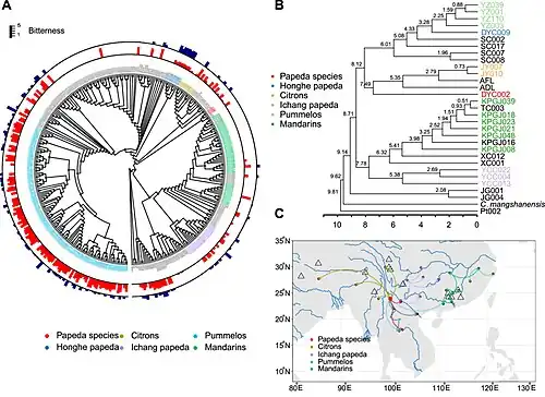 Ces auteurs notent que la domestication des agrumes réduit l'amertume du fruit, elle exerce des pressions de sélection sur des gènes impliqués dans la biosynthèse des limonoïdes et des flavonoïdes[16].