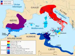 À l'époque de sa plus grande expansion territoriale, en , l'aire d'influence de Carthage était constituée de la majeure partie de la Méditerranée occidentale par le biais de ses comptoirs en Afrique du Nord (dont l'ouest de la Libye et au moins une partie de la côte maurétanienne), en Sicile, en Sardaigne, aux îles Baléares et en Hispanie, sans compter de petites îles comme Malte, les îles Éoliennes et les îles Pélages, mais aussi par le contrôle qu'elle exerçait sur d'anciens établissements phéniciens tels que Lixus (près de Tanger au Maroc), Mogador (actuelle Essaouira sur la côte atlantique du Maroc), Gadès (actuelle Cadix en Andalousie) et Utique. Parmi les grandes cités puniques figurent, outre la capitale Carthage, Hadrumète, Ruspina, Carthagène ou encore Hippone.