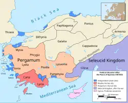 Aux côtés de ces trois monarchies principales, existent des royaumes plus petits et souvent soumis à eux, tel celui des Attalides autour de Pergame qui émerge autour de 270, ou encore ceux du Pont et de Bithynie. Il existe également des confédérations de cités qui s'opposent, parfois avec succès, aux entreprises des royaumes hellénistiques. Les deux plus importantes sont sans doute la ligue achéenne et la ligue étolienne, qui jouent un rôle notable jusqu'à la conquête romaine. De même, certaines cités parviennent à préserver totalement leur indépendance et à entretenir des relations d’égal à égal avec les royaumes ; la cité de Rhodes en est probablement le meilleur exemple. Comme si cela ne suffisait pas, les années 280-278 voient le début d'une invasion de tribus celtes, les Galates, qui dévastent le nord de la Grèce balkanique et progressent jusqu'à Delphes où ils sont repoussés. Ils se dirigent alors vers l'Anatolie, et prennent pied dans ses plateaux centraux où ils deviennent une menace pour les royaumes voisins[61].