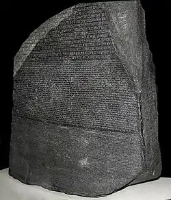 L'autre grand type de source écrite sont les inscriptions étudiées par l'épigraphie : il s'agit de textes antiques de longueur très variable mis au jour lors de fouilles accomplies depuis l'époque moderne, et surtout à l'époque contemporaine. Elles se présentent sous divers supports : des tablettes de bois ou d'argile, de la pierre, du métal, des tessons de céramique (ostraka). En alphabet grec, cette catégorie comprend notamment des lois sacrées de sanctuaires et d'autres textes religieux, des épigrammes funéraires, des décrets civiques ou royaux, des lettres royales, des traités de paix, des ventes de terres. En égyptien hiéroglyphique ou en démotique, il s'agit aussi de décrets, parfois bilingues avec une version en grec, ou trilingue comme la pierre de Rosette, l'inscription la plus célèbre de la période. En babylonien cunéiforme, des milliers de tablettes cunéiformes proviennent de quelques sites, avant tout Babylone et Uruk, et documentent les activités du milieu des temples : textes rituels, littéraires, astronomiques-astrologiques (dont des éphémérides donnant des informations sur divers événements), des chroniques historiques, également des textes économiques et juridiques. D'autres inscriptions de la période sont en alphabet araméen, en phénicien, en nabatéen[32],[33],[34],[35].