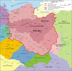 Civitas Schinesghe est officiellement le premier nom, écrit, de la Pologne vers 991-992. L'acte originel n'existe plus, mais il est mentionné dans une copie papale (Regesta (en)) du XIe siècle, le Dagome Iudex, selon laquelle le duc Mieszko Ier de Pologne et sa seconde épouse Oda ont mis « unam civitatem in integro, que vocatur Schinesghe » (un État entier, qui est appelé Schinesghe) sous le patronage du Saint-Siège.