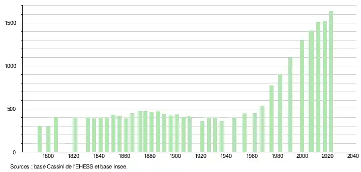 L'évolution du nombre d'habitants est connue à travers les recensements de la population effectués dans la commune depuis 1793. Pour les communes de moins de 10 000 habitants, une enquête de recensement portant sur toute la population est réalisée tous les cinq ans, les populations de référence des années intermédiaires étant quant à elles estimées par interpolation ou extrapolation[3]. Pour la commune, le premier recensement exhaustif entrant dans le cadre du nouveau dispositif a été réalisé en 2007[4].