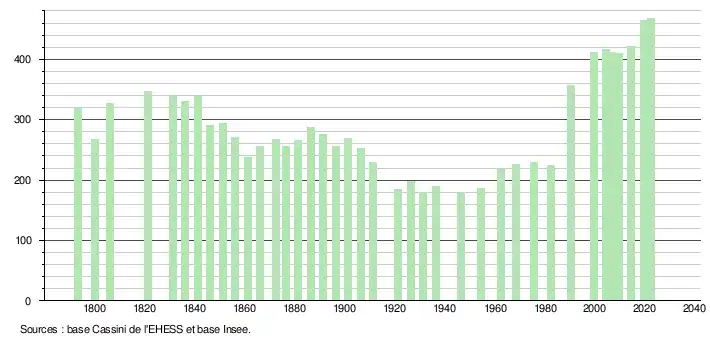 L'évolution du nombre d'habitants est connue à travers les recensements de la population effectués dans la commune depuis 1793. Pour les communes de moins de 10 000 habitants, une enquête de recensement portant sur toute la population est réalisée tous les cinq ans, les populations de référence des années intermédiaires étant quant à elles estimées par interpolation ou extrapolation[19]. Pour la commune, le premier recensement exhaustif entrant dans le cadre du nouveau dispositif a été réalisé en 2004[20].
