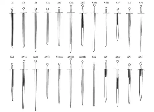 La classification des épées médiévales d'Oakeshott a été rédigée par l'historien et illustrateur Ewart Oakeshott, qui a consacré une bonne partie de sa vie à étudier les armes et armures de l'époque médiévale et du début de la Renaissance. En étudiant le matériel de guerre médiéval, il a considérablement influé sur la compréhension actuelle que nous avons non seulement de la guerre à cette époque, mais aussi des technologies et des multiples évolutions en matière d'armement au long de cette période[1]. L'épée, en tant que symbole d'une époque[2], a fait l'objet d'une étude attentive dont est ressortie une typologie chronologique montrant l'évolution de l'épée des dérivés du glaive romain à l'apparition des premières rapières (à l'exclusion de celles-ci), sur une période qui s'étale approximativement du XIe au XVe siècle. La classification s'intéresse bien sûr à la lame (sa forme, sa longueur, l'évolution de sa section), mais aussi à la garde, au pommeau et à la fusée.