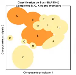 C'est une nouvelle campagne de mesures, la phase II du projet Small Main-Belt Asteroid Spectroscopic Survey (SMASS-II) conduite entre 1993 et 1997 par spectrographie CCD[1] avec une résolution jusque là jamais atteinte, qui permet à Schelte J. Bus, dans le cadre de son travail de thèse sur les familles d'astéroïdes, de proposer en 1999 une nouvelle classification dite de Bus ou SMASS-II. L'analyse de référence repose sur un échantillon de 1 189 astéroïdes appartenant à la ceinture principale[1] (puis 1 447 astéroïdes en 2002 en incluant les astéroïdes géocroiseurs, en collaboration avec Richard P. Binzel) dont les spectres sont décrits par 49 points[22] sur la zone visible 0,44-0,92 μm[1]. Contrairement à Tholen qui utilisait aussi l'albédo, Bus propose délibérément de créer une taxonomie purement spectrale. La taxonomie obtenue via une analyse en composantes principales[1] comprend 26 classes dont la plupart sont des subdivisions de trois « complexes » S, C et X, notées via l'introduction d'une notation à deux lettres (par exemple Sq pour indiquer une classe du complexe S ayant des traits de la classe Q). Le complexe X et ses subdivisions remplacent le groupe X de Tholen et les classes E, M et P qui y étaient distinguées par l'albédo. Il apparait également deux nouvelles classes L et Ld.