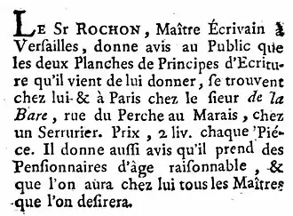 - Pièces de principes d'écriture, par le sieur Rochon, maître à écrire & d'arithmétique à Versailles. « Ces deux pièces, gravées sur une seule feuille, renferment généralement tout ce qui concerne l'écriture. Elles sont dédiées à M. le Comte de Noailles, & se vendent chez l'Auteur même, à Versailles. » (Mercure de France, ).